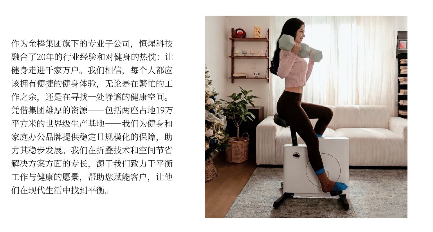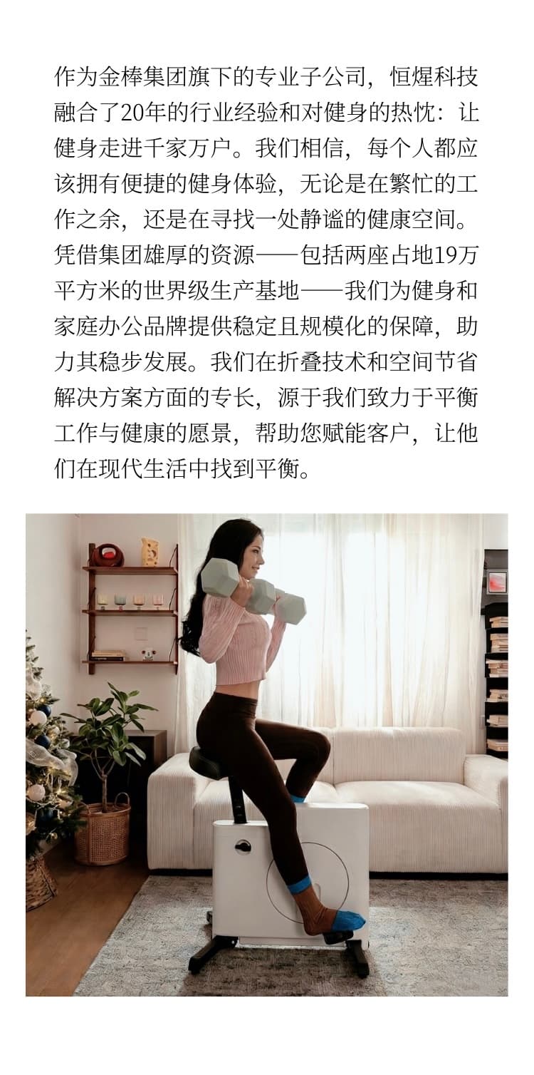 浙江恒煋科技有限公司隶属于金棒控股集团,是一家专注于家用健身器材设计、研发、生产、销售的ODM/OEM型企业,主要产品包括健身车、动感单车、力量站、跑步机等有氧和无氧健身器材。